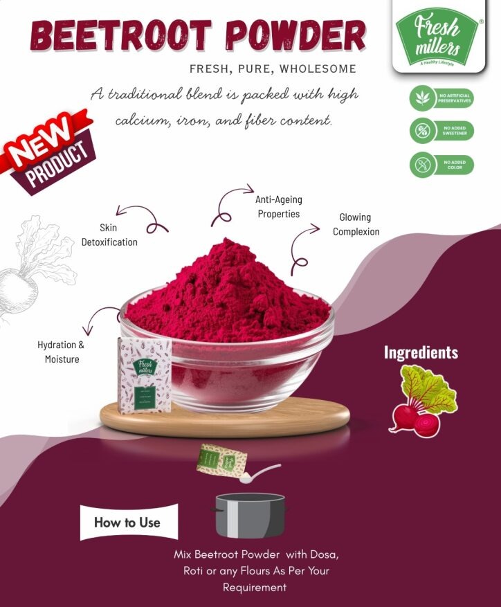Fresh Millers Beetroot Powder – a wholesome, 100% natural superfood packed with iron, fiber, and antioxidants. Perfect for health drinks, smoothies, and cooking, crafted with care to bring daily wellness to your home.
