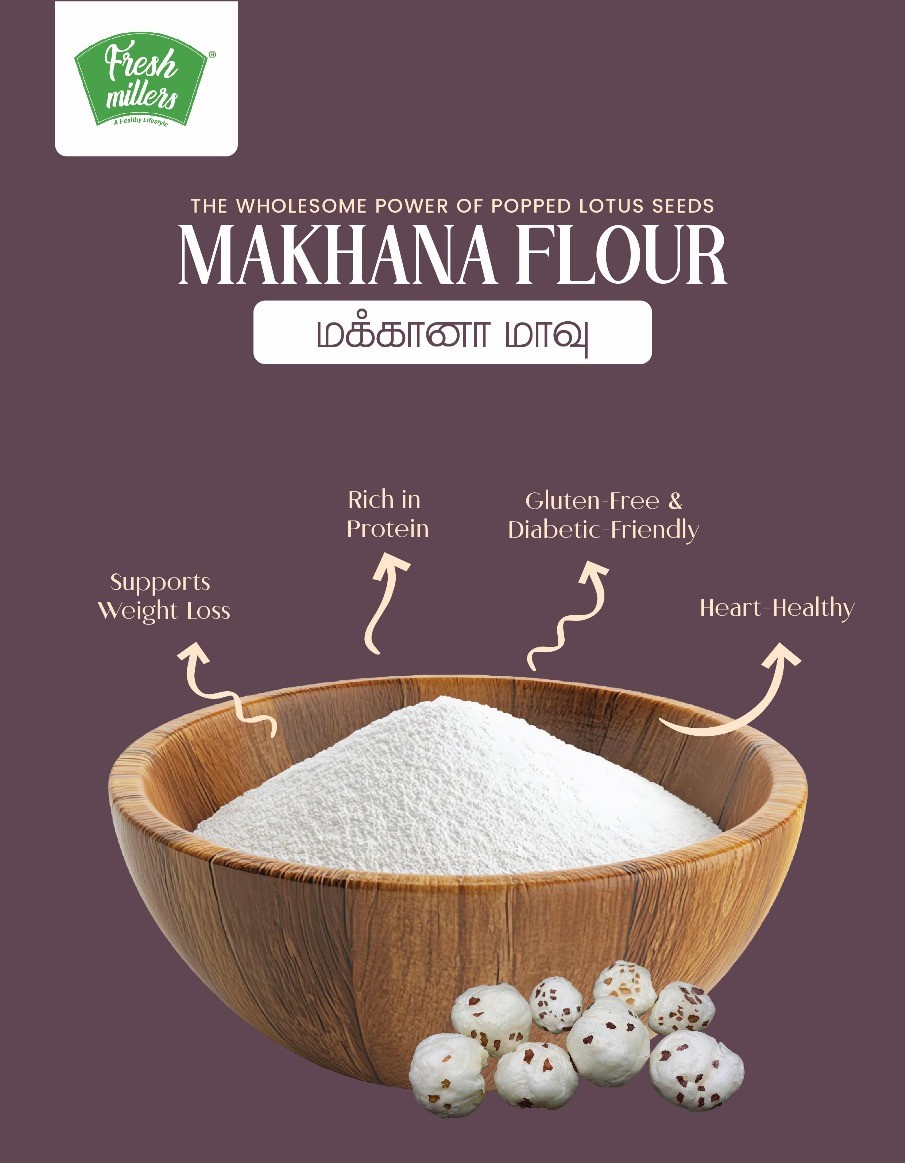 Makhana Flour Made from premium-quality fox nuts, this traditional blend is an energetic mix of pure Makhana—naturally high in protein and antioxidants. A wholesome, gluten-free flour perfect for nutritious meals and healthy indulgence.