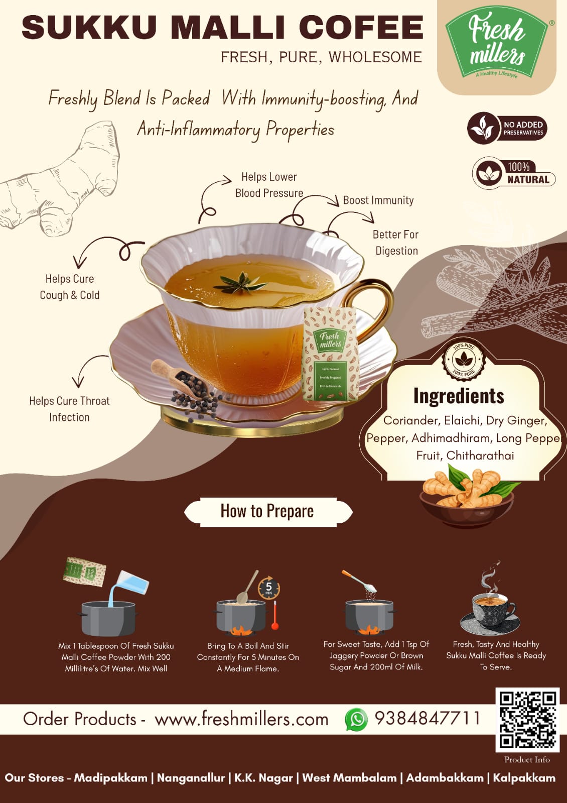 Sukku Malli Coffee from House of Fresh Millers is a traditional herbal health drink featuring coriander, elaichi (cardamom), dry ginger, pepper, adhimadhuram (licorice), long pepper fruit, and chitharathai (lesser galangal). Packed with immunity-boosting and anti-inflammatory properties, this 100% natural, freshly prepared blend offers an authentic taste and natural flavor, making it a comforting and wellness-enhancing beverage.
