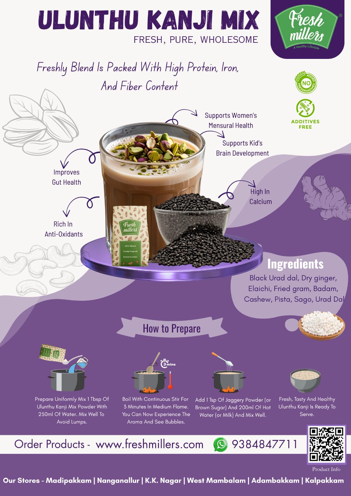 Ulunthu Kanji Mix from House of Fresh Millers is a nutrient-rich porridge blend featuring urad dal, black urad dal, fried gram, sago, elaichi (cardamom), dry ginger, badam (almond), pista (pistachio), and cashew. Packed with high protein, iron, and fiber, this freshly prepared, preservative-free mix offers a nutri–balanced recipe with no added sugar or milk solids, making it a wholesome and customizable kanji for overall wellness.